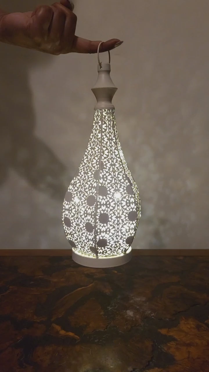 The Moroccan Ivory lantern is shaped like a flask. The lantern has l has small intricate designs complimented with various patterns and circles. Can be situated anywhere in the home, with a cream based color suiting almost any setting. This is a LED lantern and uses 3 x AAA batteries.