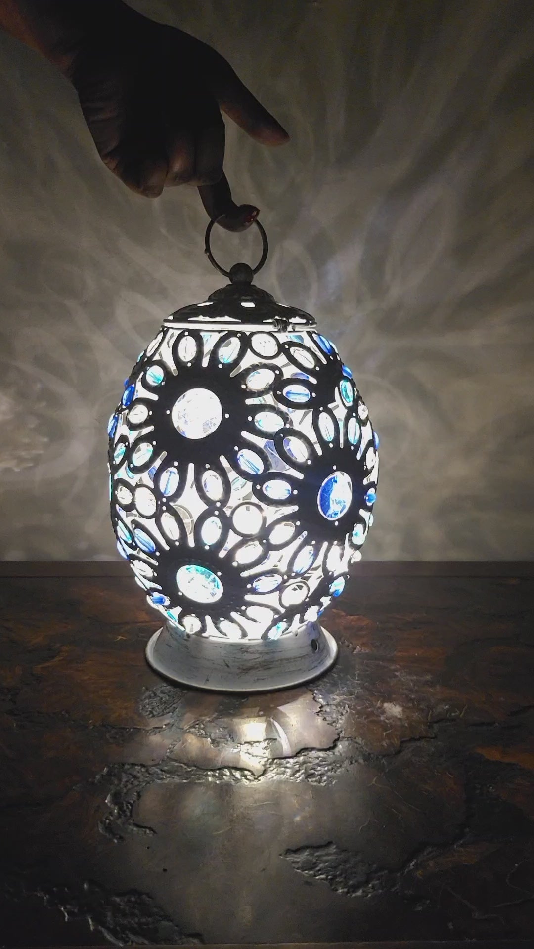 The gemstone led lantern has a spectacular design with the hand tightened beads. The lantern is white with gold and brown brush strokes. The metal is heavy and is of quality make. The light blue, blue and white beads bring the lantern to life when it is switched on creating a gorgeous effect.