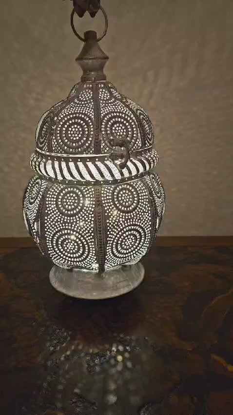 The Moonlit Mirage lantern has gorgeous designs and patterns. The pearl color is mixed with brushes of brown and gold creating an artistic and rustic effect. The lantern is made from solid metal, hand made with quality material with a unique design.