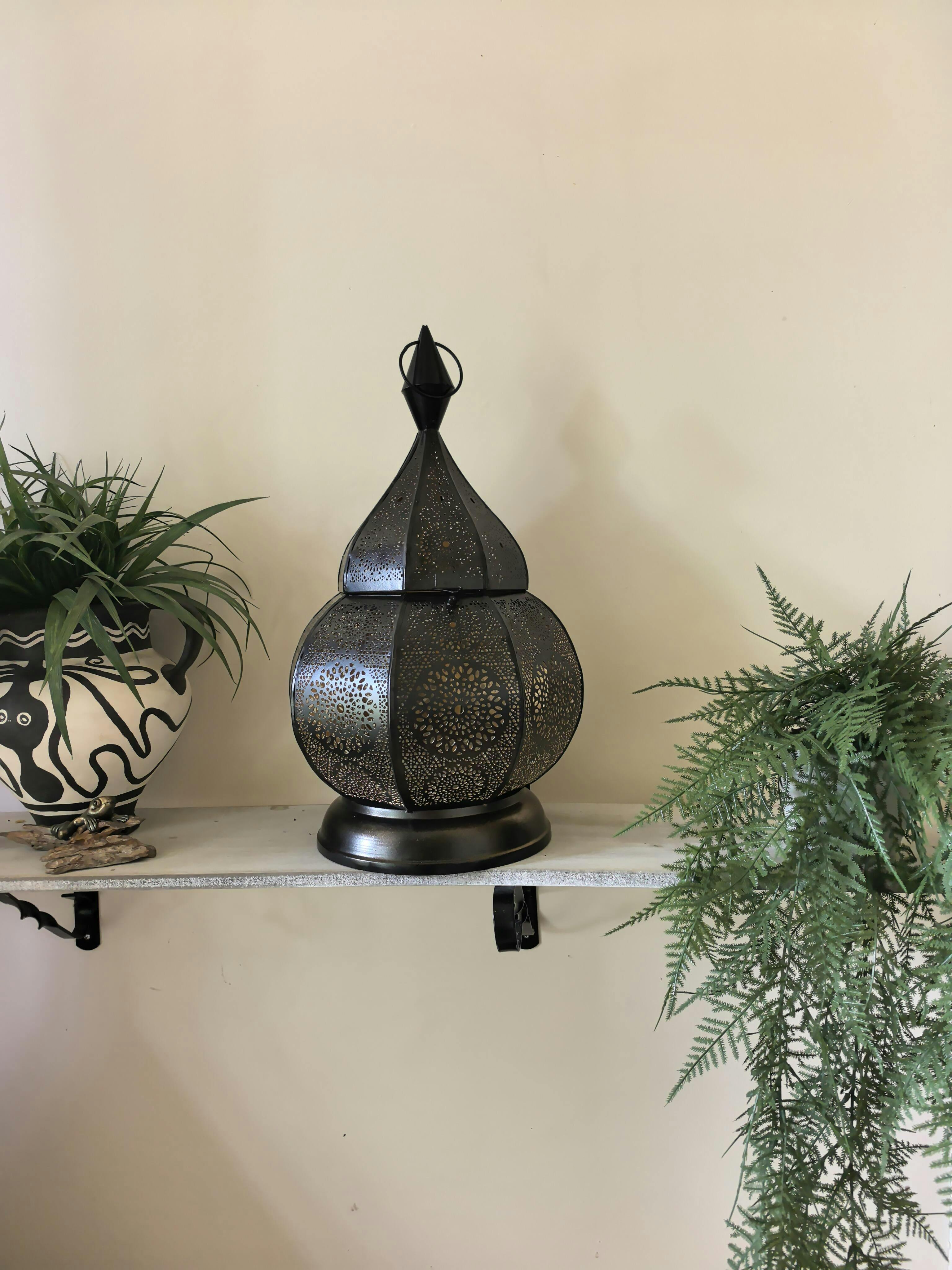 This large hand made Moroccan Lantern is the pinnacle centerpiece. Hand carved from iron. Colored outside Iron Black and inside Saffron Gold. This lantern works from the light of Candles. A marvelous background accompanies the soothing light.